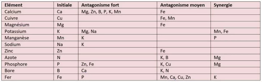 - Soit par la présence d’un autre élément en excès comme le blocage du magnésium face à un excès de potassium, le blocage du zinc suite à un excès d’acide phosphorique, le blocage du potassium suite à un excès de calcium, ou encore le blocage du fer dans des terrains trop calcaires.
